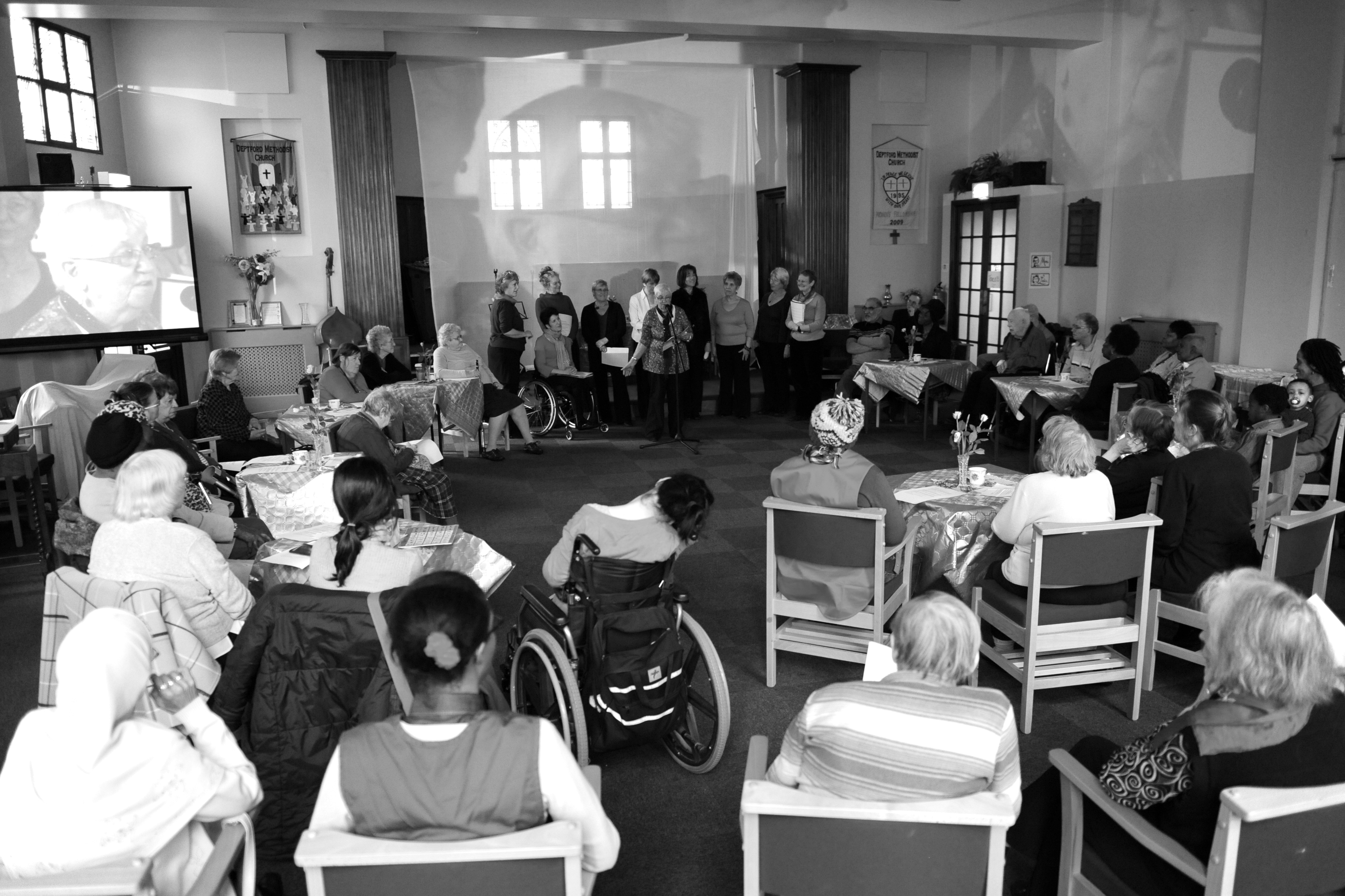 This week in London Entelechy is setting up a base camp in one of our own forays into the territory. In a residential care home, Manley Court, we are working with residents and staff to co-curate one of our 21st Century Tea Dance series. The event will take place in the corridors, lifts, bedrooms and nurses stations of the large nursing home. There will also be a big marquee directly outside the home with performances and live music, and open to the general public. We have commissioned Jazz producing agency The Spitz co-produce the event. One resident who will be the compare for the day, and used to be a professional performer in Butlins holiday camps, has decided he would like to reverse things a bit and dress up as a nurse. Double bass players, trumpeters and vocalists will be singing in lifts and peoples bedrooms, masseurs will be providing neck and shoulder massage and hand massage in the middle of the Marquee t-dance. A resident and his wife will open the event with a slow samba dance as it’s their 54th wedding anniversary.
